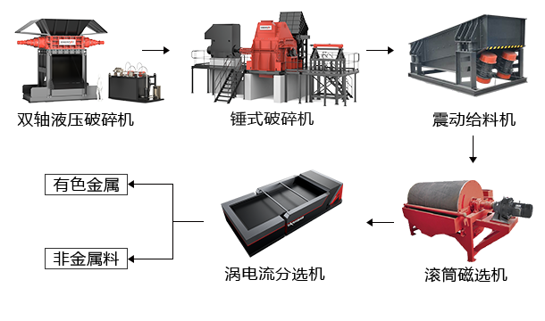 链板输送机将汽车外壳均匀输送至双轴破碎机破碎刀箱内,合金钢刀具对汽车外壳进行预破碎,再经过锤式破碎机将金属打散,并将其卷成球状,同时可以分离依附在金属上的其他杂质。震动给料机将破碎料震散,并均匀输送到磁选机磁选,分离出铁金属,其余物料进入涡电流分选机分选,分离出有色金属和杂质。 点击查看解决方案 >>