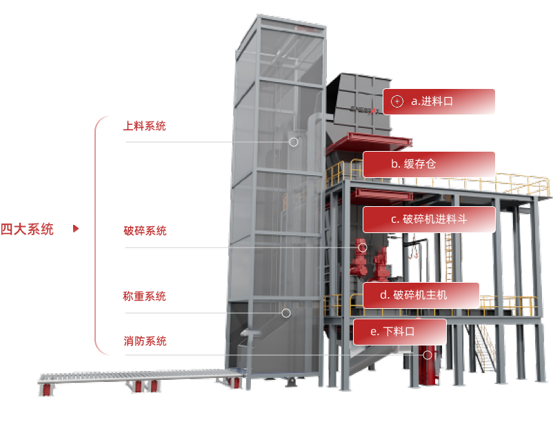 提升系统将锂电池提升并送入密封缓存仓,仓内随即被注入氮气以降低氧气浓度,当氧含量<5%时阀门打开, 物料落入被氮气保护的密闭破碎系统中破碎成30mm尺寸,通过下料斗排出,再由绞龙输送机输送至下道工序。系统运行中, 在线监测系统连续监测系统内的氧气浓度,实时保持氮气保护系统处于防护达标状态,起到主动消防作用。若发生火情,智能监测系统立即报警,破碎系统将自动停机,系统阀门执行关闭,及时隔断火焰与空气接触,阻止火势蔓延。与此同时,二氧化碳灭火系统自动开启,对起火点实施灭火。 点击查看解决方案 >>