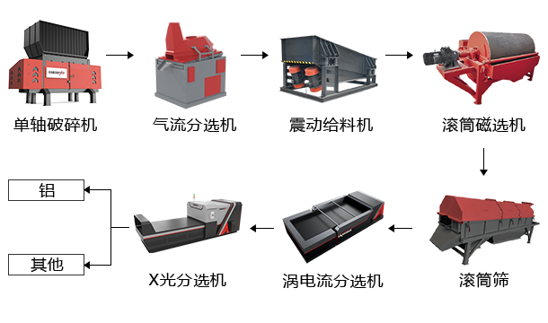 上料输送机将易拉罐均匀输送至单轴破碎机,将易拉罐粉碎成较小粒度,破碎料通过气流分选机分离出轻飘物,其余物料通过震动给料机震散,并均匀输送至磁选机,分离出铁金属,其余物料进入涡电流分选机,分选出有色金属和塑料,有色金属再通过X光分选机,分选出铝和铜,经生产线处理后铝回收纯度超过98%。 点击查看解决方案 >>