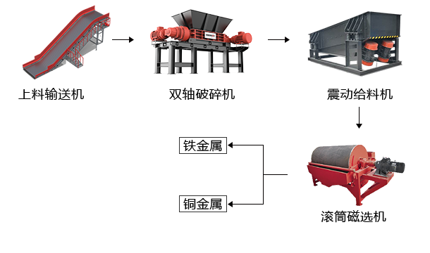 链板输送机将铜废料均匀输送至双轴破碎机的破碎刀箱内,通过剪切和撕裂作用将铜废料破碎成较小规格物料,震动给料机将破碎料震散,并均匀输送到磁选机磁选,分离出磁性金属和铜金属。