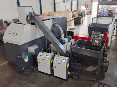 再通过振床进行筛分,其中大于15mm的物料返回到破碎机继续粉碎;3-15mm之间物料送入到色选机,去除杂质,小于3mm物料通过料箱存储;分选后的3-15mm物料经过磁选机,去除铁金属,再送入清洗烘干一体机中,进行清洗、烘干;最后经压饼机压缩成圆饼,便于回炉重融再利用。