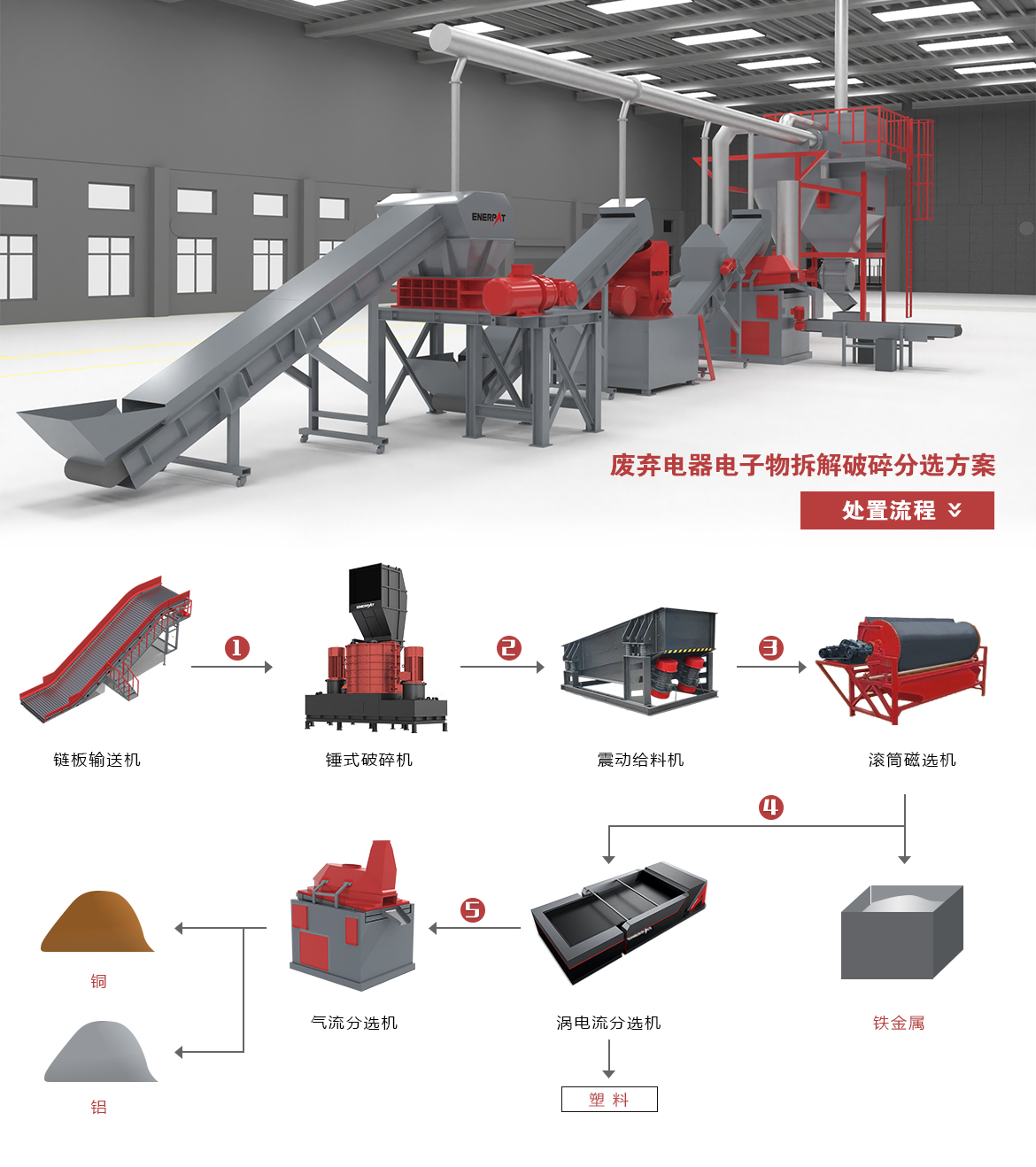 简介:恩派特废弃电器电子物拆解破碎分选方案采用模块化设计,生产线涵盖:上料系统、破碎系统、磁选系统、分选系统等。