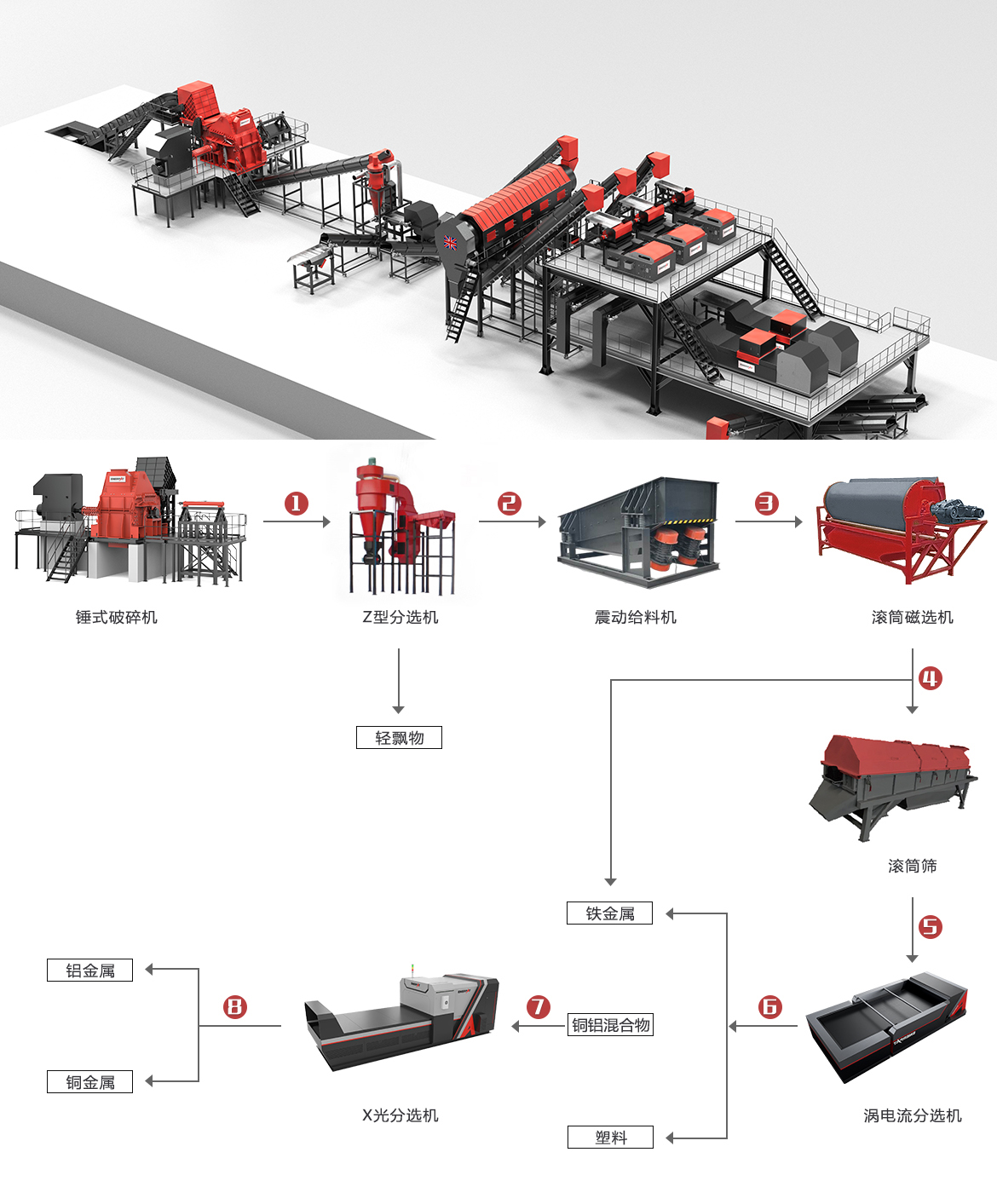 3、深度分选物料,纯度达98%以上通过磁选、涡电流分选、X光分选等技术,精准分离铝、塑料等不同材质,铝回收纯度超过98%,塑料回收率从30%到70%不等,铜回收率超过95%,其他金属回收率在70%到80%之间。