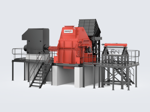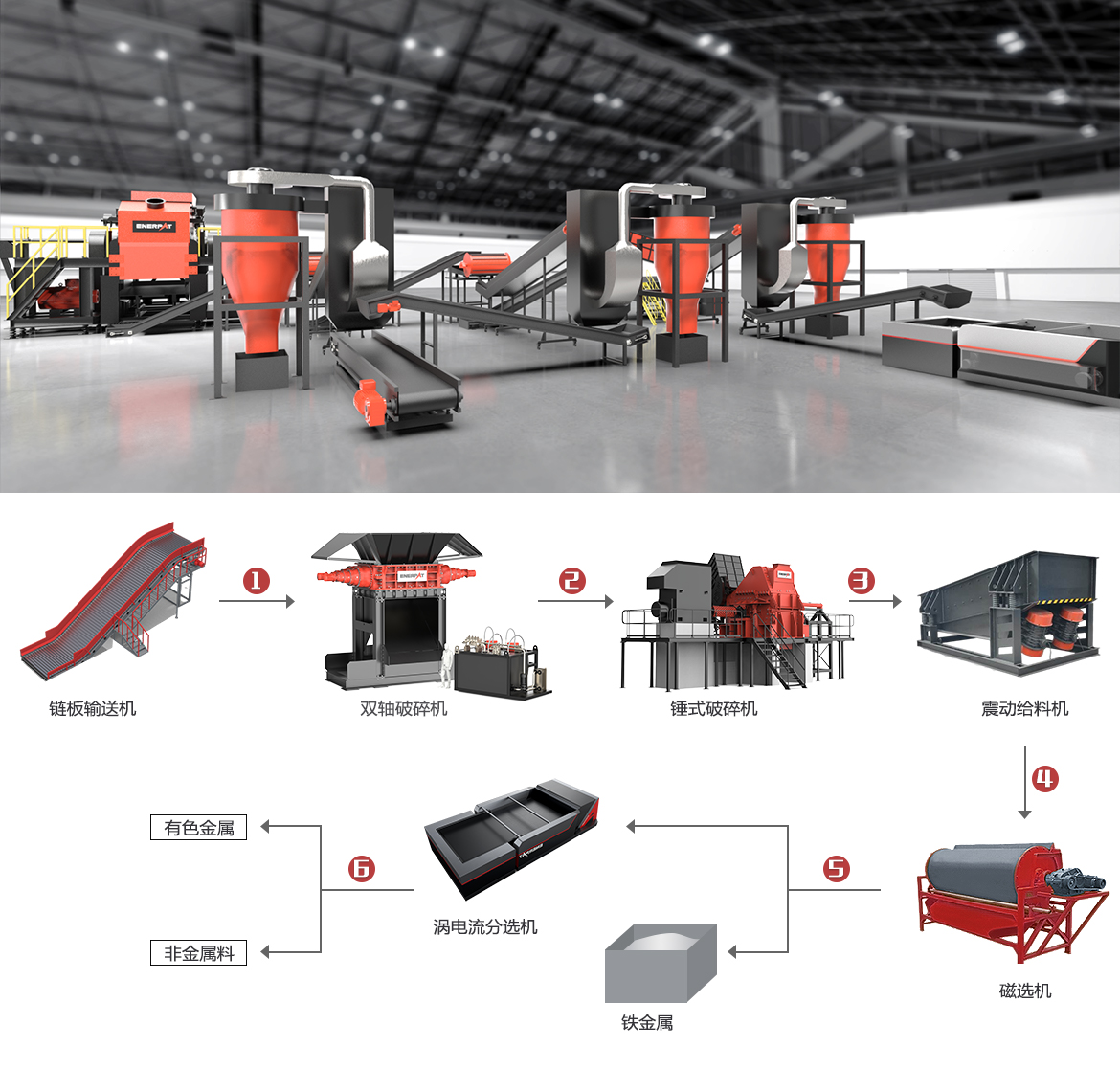 破碎系统锤式破碎机通过锤击将汽车外壳打散,再将其卷成球状,同时可以分离表面杂质,便于后续分选,具有破碎效果好、产量大等特点。