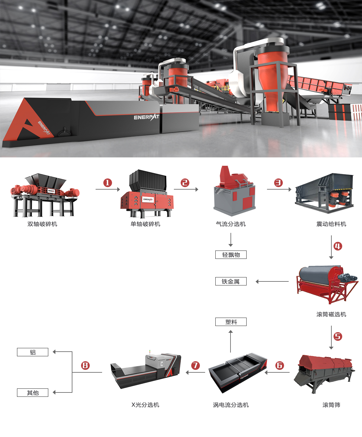 3、深度分选物料,纯度达96.5%以上通过磁选、涡电流分选、X光分选等技术,精准分离铝、塑料等不同材质,铝回收纯度超过96.5%,塑料回收率从30%到70%不等,铁回收率超过90%,其他金属回收率在70%到80%之间。